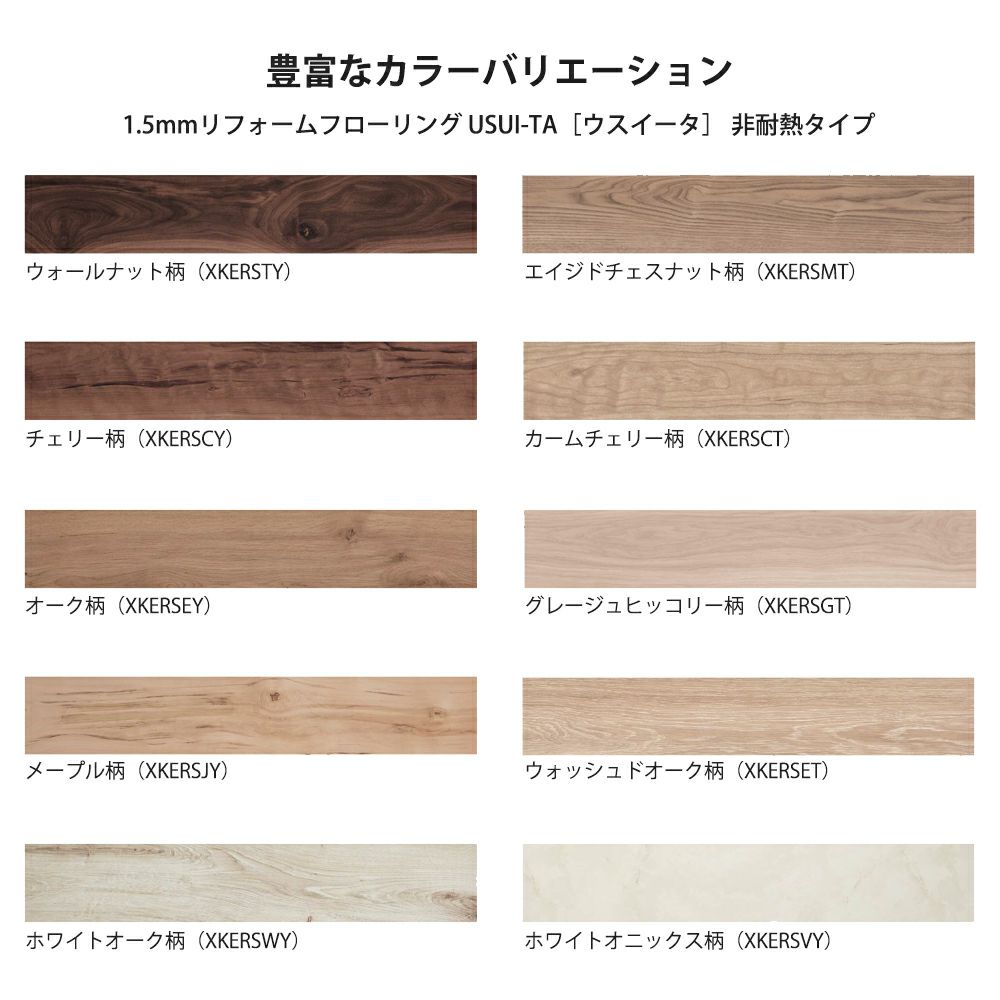 他の画像を見る 1.5mm厚の上貼りリフォーム用床材 パナソニック XKERS ウスイータ 非耐熱タイプ + 専用両面テープセット USUI-TA 1.5mm厚 リフォームフローリング 1ケース24枚入(3.3㎡) KEBTT48 送料無料 メーカー希望小売価格 ¥ 27,610 のところ ¥ 18,766 税込 カートに入れる お気に入りに登録する