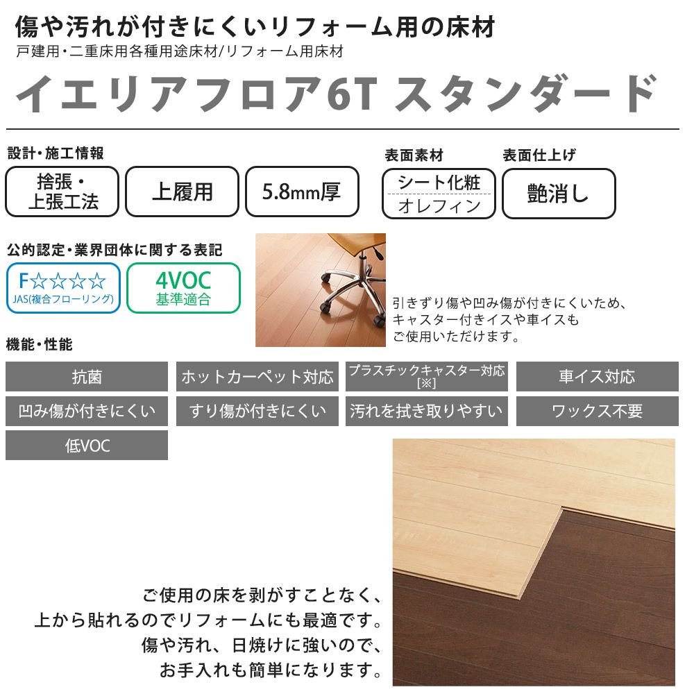 他の画像を見る 大建工業 イエリアフロア6T スタンダード 6枚(3.3㎡)/梱 抗菌 床暖房対応 戸建用・二重床用各種用途床材 YN7901 DAIKEN NEW 送料無料 メーカー希望小売価格 ¥ 23,320 のところ ¥ 17,776 税込 詳細を見る お気に入りに登録する