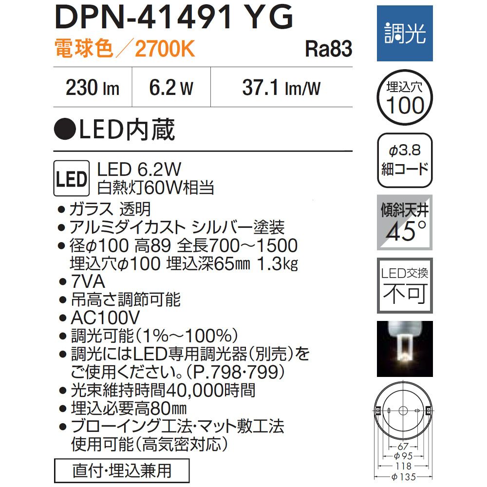 他の画像を見る DAIKO ペンダントライト DPN-41491YG フランジタイプ 直付・埋込兼用 電球色 調光 LED内蔵 メーカー希望小売価格 ¥ 30,250 のところ ¥ 16,797 税込 詳細を見る お気に入りに登録する