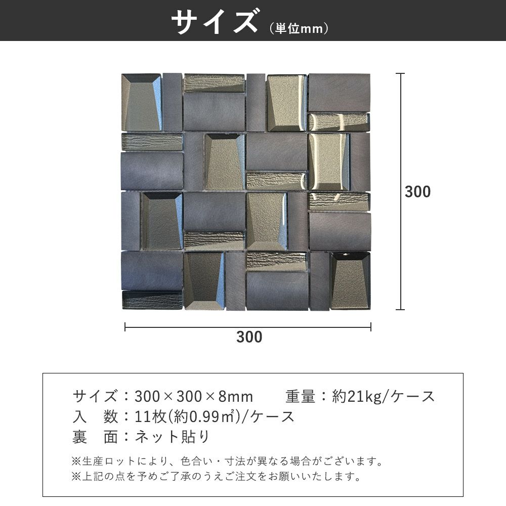 他の画像を見る マヤリカ RSBSJ173 ガラスタイル 300×300×8mm 正方形 ガラス メタル 異素材 11枚/ケース バラ1枚単位 ¥ 2,695 税込 〜 ¥ 税込 詳細を見る お気に入りに登録する