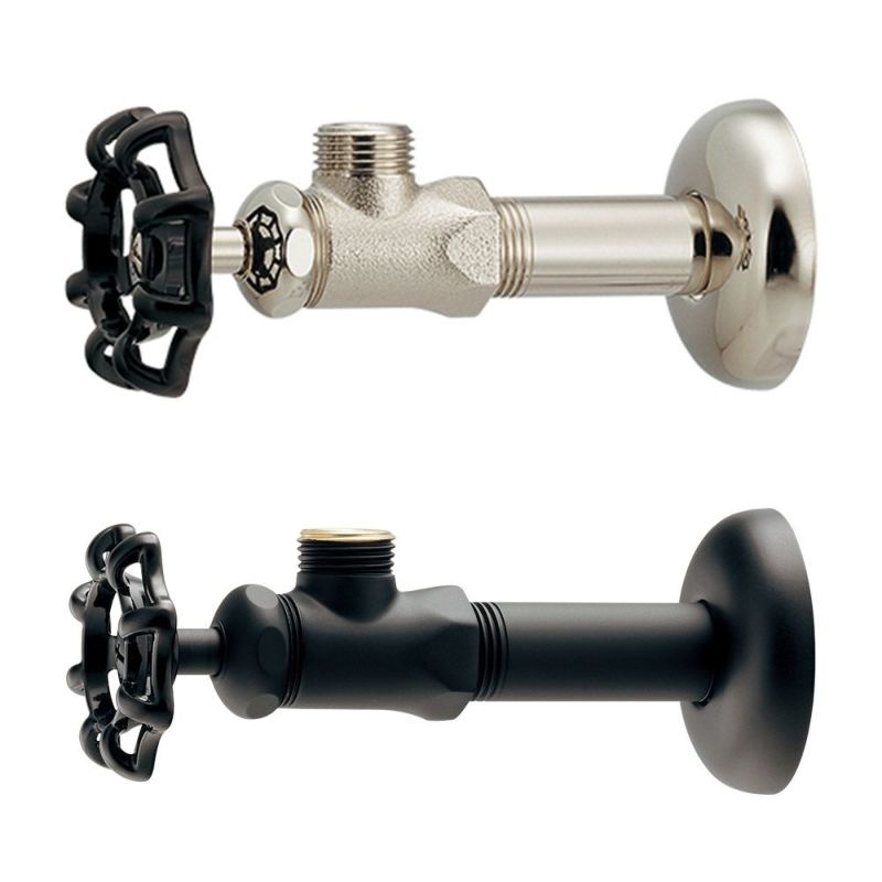 無骨な印象のアングル形止水栓。インダストリアル水栓と好相性です。