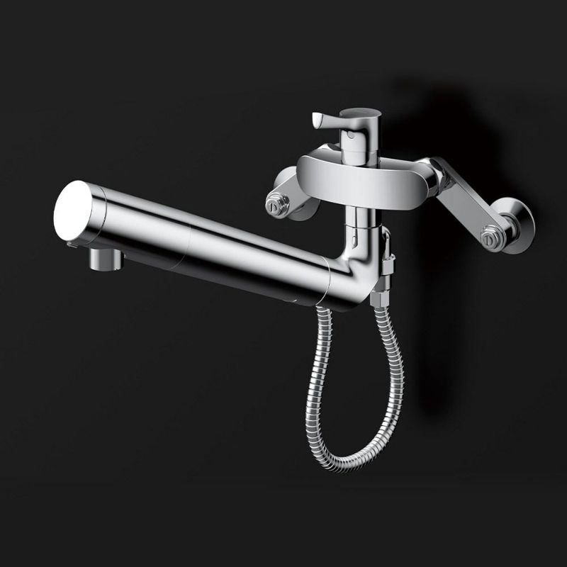 キッチンでシンクと組み合わせて使ったり、ランドリールームでスロップシンクと組合わせて使ったりと幅広い用途で使える壁付水栓。ハンドシャワー付きでシンクの隅々まで水をかけられます。